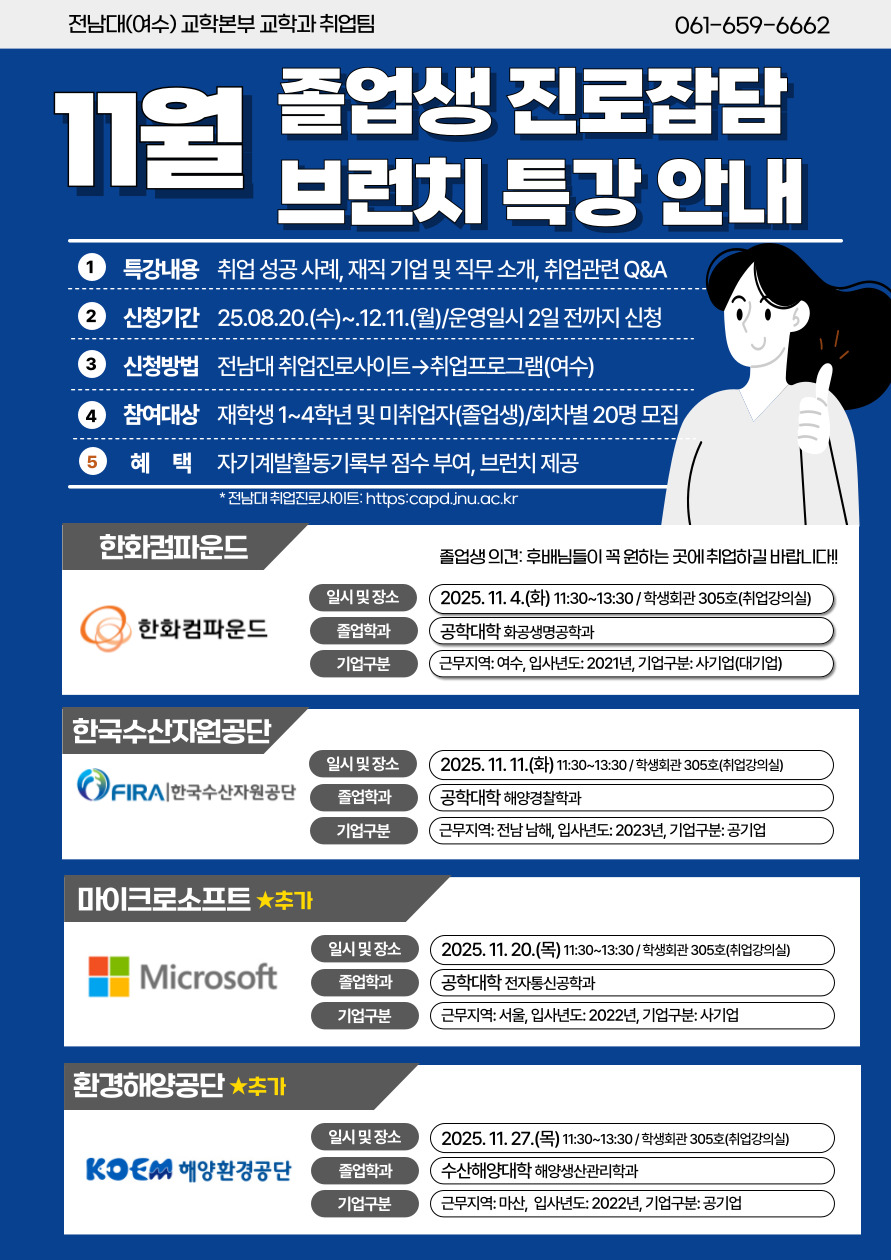 [취업정보][여수] 2025학년도 졸업생 진로잡담 브런치 특강: [해양환경공단(★추가)-11.27.(목) 11:30~13:30]